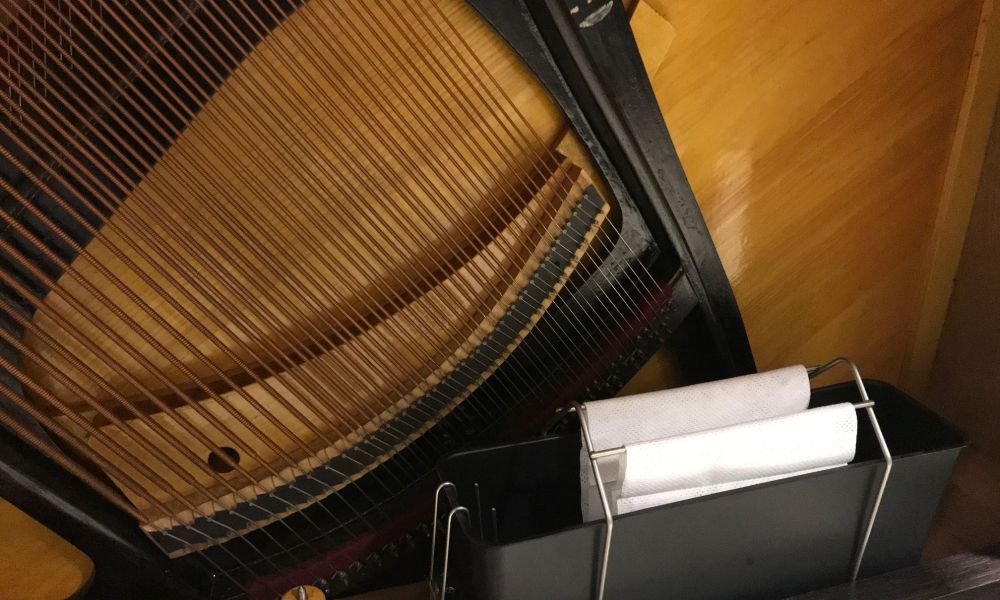 Ein mit Edelstahlbügel bestückter Wasserbehälter speziell für Klaviere. Mittels über Stahlbügel gelegten Vliesstoffbahnen, deren Schlaufen den Behälterboden berühren, kann das darin befindliche Wasser gleichmäßig und optimal verdunsten. An der schmalen Außenwand positionierte Batterien geben Kontakt mit einem in einer Metallführung befindlichen "Schwimmer" mit zur Außenwand gerichtetem Magneten in der Behälterinnenseite. Sobald der Schwimmer den Boden berührt, wird ein Signal ausgelöst, um zum richtigen Zeitpunkt Wasser nachfüllen zu können.